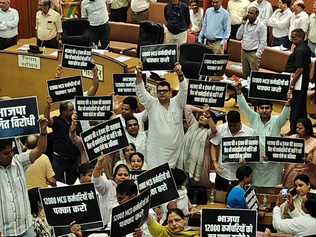 AAP demonstrates in MCD House demanding regularisation of 12,000 employees