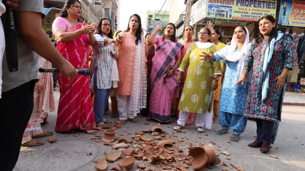 AAP Mahila Wing held a ‘Matka Phod’ protest in Bawana demanding water from CM Rekha Gupta