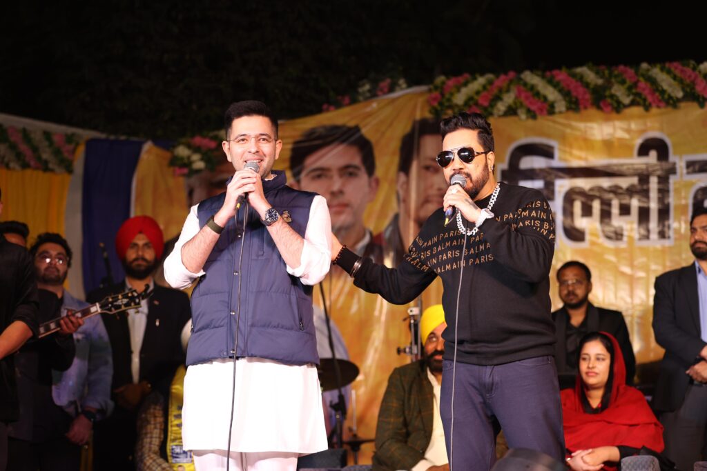 Singer Mika Singh and MP Raghav Chadha perform together on election stage, crowd cheers