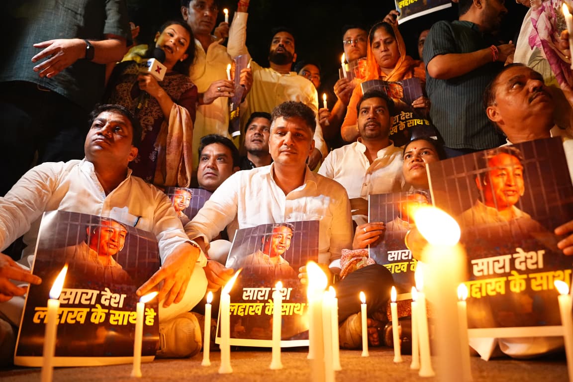 Protests over the arrest of social activist Sonam Wangchuk spread from Ladakh to the national capital on Friday evening, as the Aam Aadmi Party (AAP) held a candle march in Delhi. Led by Delhi State President Saurabh Bharadwaj, a large number of AAP karyakartas marched with candles, chanting slogans against the BJP and the Modi Government.